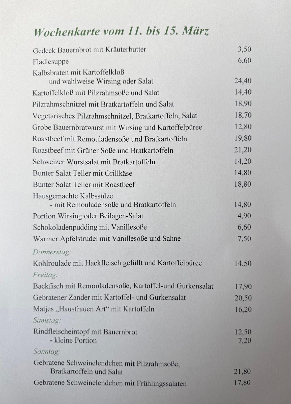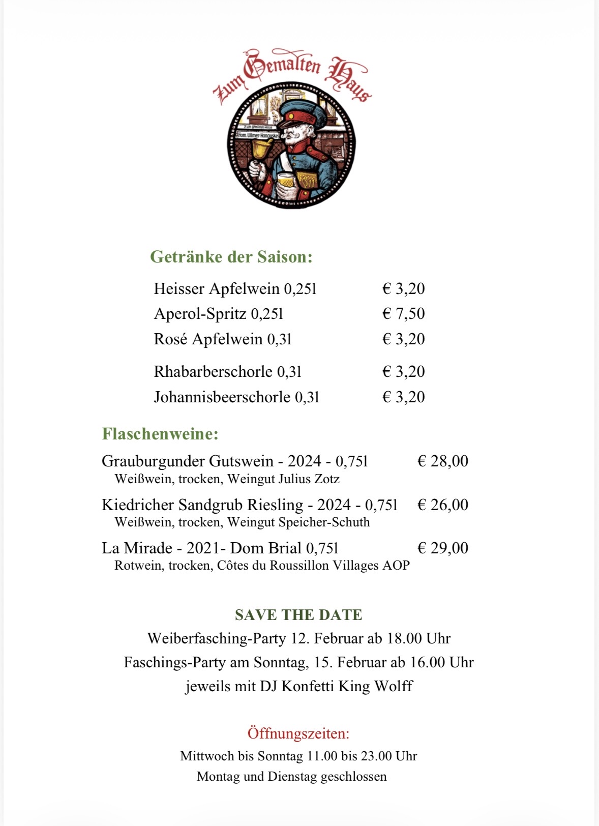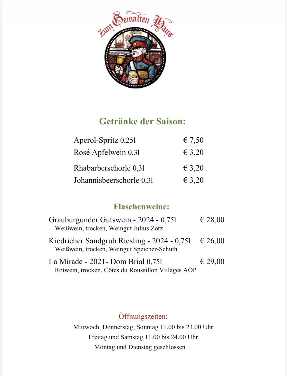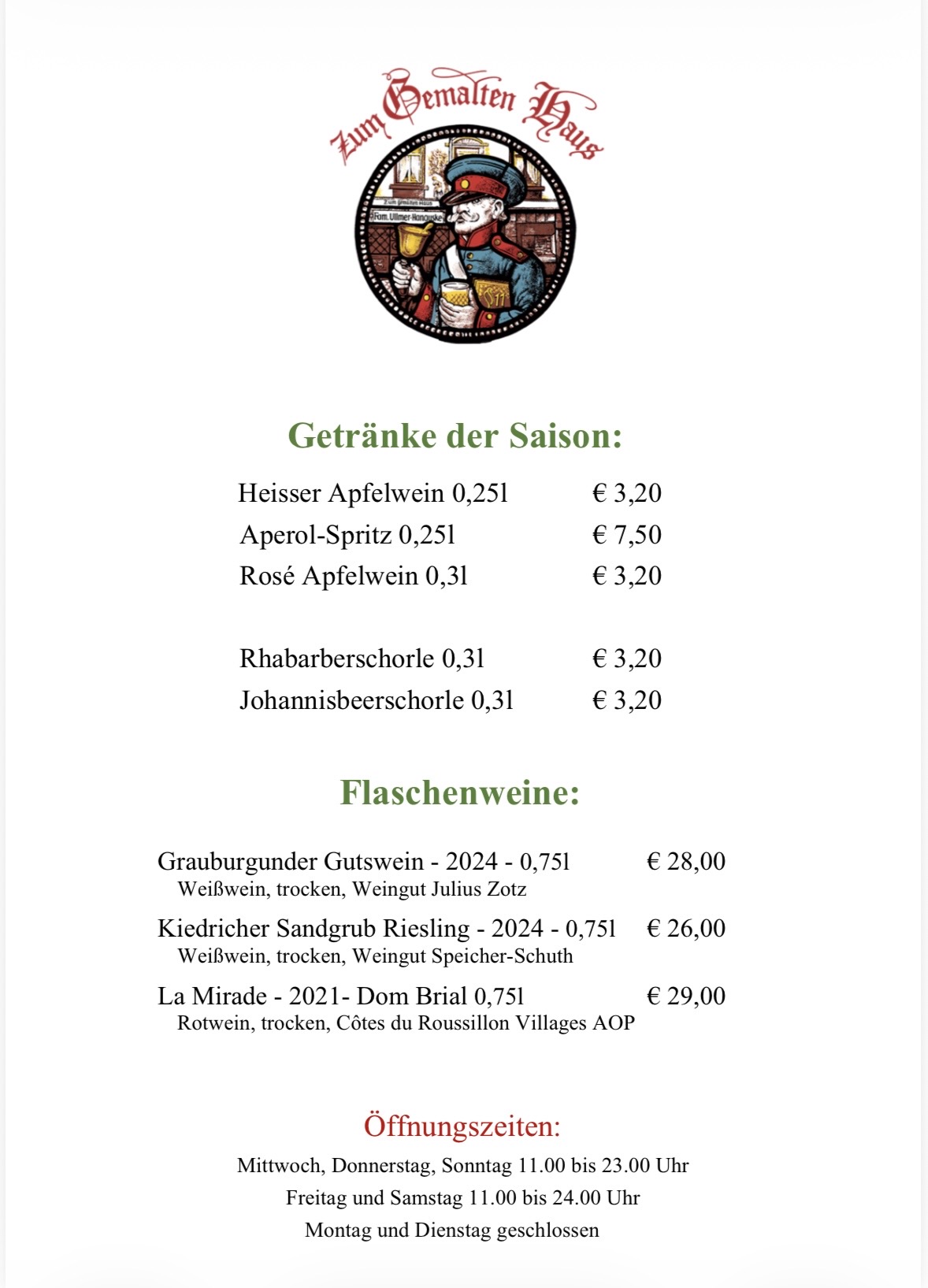 Besonders beliebt ist das Gemalte Haus für sein Rippchen mit Kraut, und fast schon legendär ist seine preisgekrönte Grüne Soße. Seit einigen Jahren gibt es darüber hinaus ein täglich wechselndes „Stammessen“, das manchmal gebraten ist. Den modernen Zeiten geschuldet ist ebenfalls, dass man heute Bratkartoffeln und Bier auf der Speisekarte findet. Der Brezelbub aber ist geblieben. Er geht heute noch mit einem Korb voller Backwaren durch das Gemalte Haus. Und auch sonst lebt hier überall die Tradition weiter, die sich ganz wunderbar mit der Gegenwart verträgt. Denn ein Schoppen schmeckt einfach zeitlos gut.